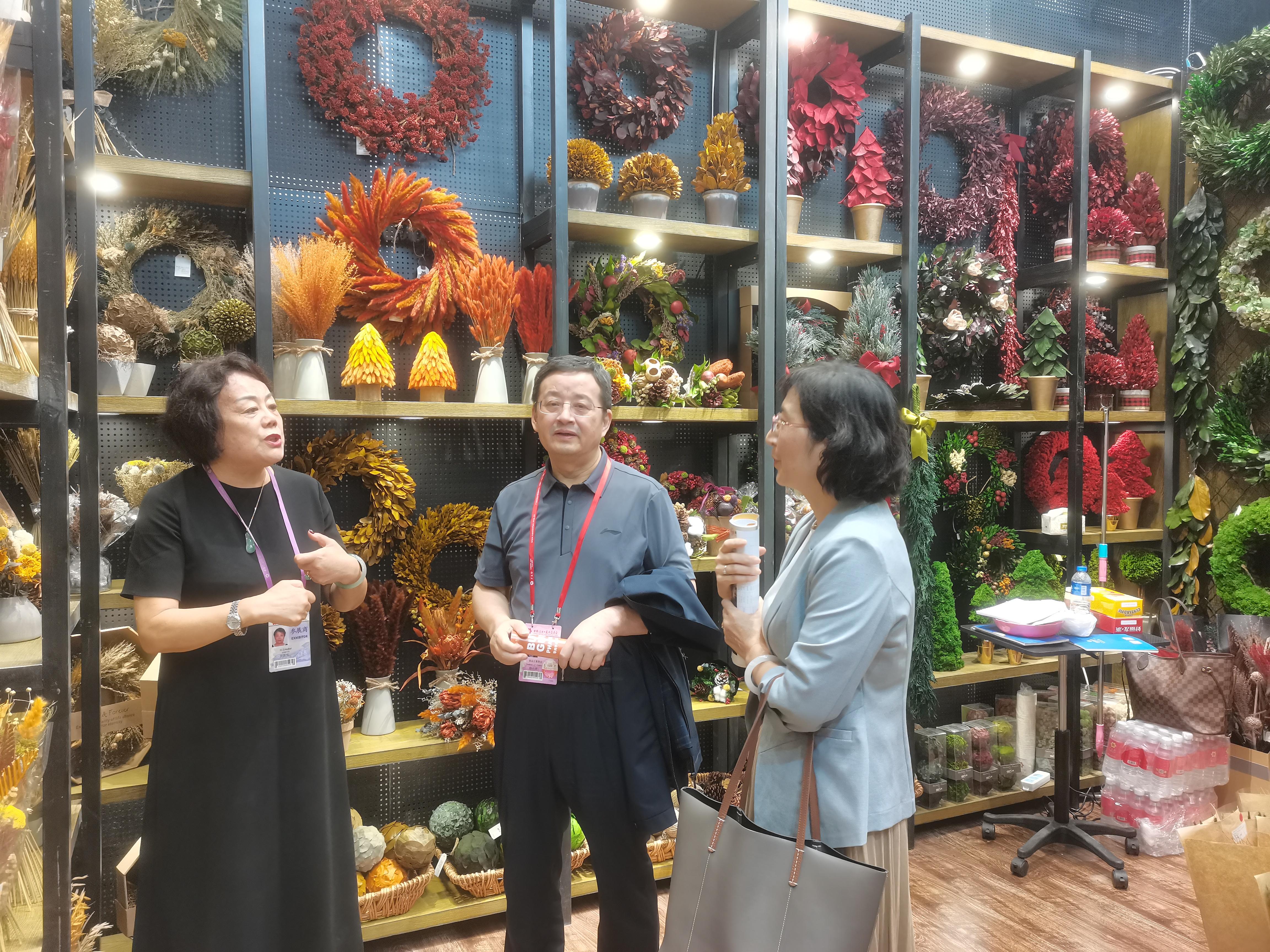 我会徐小虎副会长带队参加二期广交会积极开展调研工作,先后走访保定金萨工艺品有限公司、廊坊万森工艺品有限公司、北京普润天经贸有限公司、北京花儿朵朵花仙子农业有限公司、北京圣林润景科贸有限公司展位,深入了解企业生产和出口情况。徐小虎副会长认真观看产品展示,详细询问了解产品特性、接单数量、出口金额等情况,认真听取公司在出口过程中遇到的问题和对广交会的建议。他鼓励企业充分借助广交会平台积极宣传推介产品,也祝愿企业拿下更多订单,在本届广交会上取得满意收获。